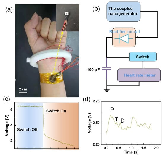 Self-powered heart rate testing system: (a) the electronic photo of system; (b) the block diagram of system composition; (c) the voltage changed at both ends of the capacitor before and after fast closing. After the switch was closed, the electric quantity in the capacitor began to power the heart rate sensor, and the voltage dropped sharply); and (d) pulse waveform collected.