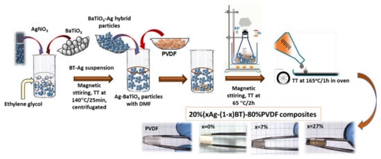 The solution was then heated to 140 °C and maintained for 25 min to allow the complete reaction and the formation of Ag nanocrystals onto the surfaces of BaTiO3 templates. The mixture was centrifugated and washed three times with ethanol and then dried at 50 °C for 8 h. The stoichiometry in the final product (x amount) was confirmed for each composition by quantitative X-ray diffraction (XRD) analysis of the composite powders, which indicated that no synthesis product was lost by washing, and confirmed the formation of xAg − (1 − x)BT hybrid composite powders with nominal compositions. Further, the xAg − (1 − x)BT hybrid particles with a total filler concentration of 20 vol.% as determined by using the theoretical densities of silver of 10.49 g/cm3, of BT of 6.08 g/cm3, and PVDF of 1.11 g/cm3, were embedded into the PVDF polymer matrix using the following method: PVDF pellets (Sigma Aldrich, Mw = 175,000) were dissolved in N, N-Dimethylformamide (DMF) of 99.5% (Merk) under magnetic stirring at 65 °C with a mass ratio 20/80. The Ag-BT hybrid particles with desired compositions were introduced in this solution and mixed by magnetic stirring for 2 h at 65 °C to allow the perfect solubilization of PVDF. The mixture product was then cast in Petri dishes and dried for one hour at 165 °C in an oven. Flexible composite films with formula 20%(xAg − (1 − x)BT) − 80%PVDF (volume ratios), where x = 0, 2, 5, 7 and 27 vol.% and thickness of about 1.5–2 μm were obtained (Figure 1).