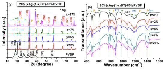 (a) XRD patterns and (b) FTIR spectra obtained for PVDF and 20%(xAg − (1 − x)BT) − 80%PVDF composites with x = 2, 5, 7, and 27 vol.% Ag.