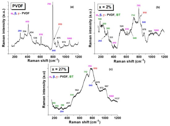 Another complementary infrared spectroscopy characterization to acquire information concerning the crystalline phases in the PVDF-based flexible hybrid composite is the Raman analysis. The room temperature Raman spectra of PVDF thick film and the 20%(xAg − (1 − x)BT) − 80%PVDF composites with two extreme compositions: x = 2 vol.% and x = 27 vol.%, shown in Figure 5, allowed the identifications of the major Raman modes characteristic to the PVDF polymer matrix [58]. It can be observed that the predominant polymorph is the α-phase (identified by its major sharp peak at 795 cm−1 and by smaller peaks at 410 cm−1, 610 cm−1, and 1060 cm−1 indicated with the pink color in the figure), together with amounts of ferroelectric polar phases: β-PVDF with the main peaks at 284 cm−1 and 840 cm−1 (denoted by the blue color), and the γ-phase identified by a small peak at 810 cm−1 (red color in Figure 5), according to the band assignment proposed in the [13,57,59,60,61] and to the results obtained using the FTIR characterization. For the composition with the small Ag addition of x = 2 vol.% (Figure 5b), the Raman spectra show the specific modes of the PVDF matrix mentioned before, with a predominant α—phase and ones of the BaTiO3 filler: a positive peak/dip around 180 cm−1, possibly related to the interference between the damping of A1(TO) phonon and orthorhombic features around 190 cm−1 [62,63,64], A1(TO1) stiffened the component of the soft mode at 250 cm−1, E+B1 exhibited a sharp peak infrared inactive („silent mode”) at 300 cm−1, A1(TO4) at 510 cm−1, and the high-frequency LO4 band at 712 cm−1 which are considered signatures of the long-range ferroelectric tetragonal phase of BaTiO3 [62,63,65]. Additionally, a small peak around 640 cm−1 (Figure 5b) indicates either traces of hexagonal symmetry of BaTiO3 or internal defects in the BaTiO3 structure [66]. Therefore, according to the present structural and microstructural analysis, BaTiO3 is clearly not in a pure cubic state (in which the Raman activity is forbidden), but in an average pseudo-cubic state as found by the large-scale XRD analysis, while at the local scale, other polymorphs as orthorhombic or hexagonal in the BaTiO3 fine powders are likely, besides the tetragonal phase, all of them characterized by the very similar interplanar distances detected. Similar findings have also been reported in the literature for fine BaTiO3 powders [39,64,66]. When the concentration of Ag nanoparticles is higher, the Raman intensity strongly increases as a result of the surface-enhanced Raman scattering process [61,67]; the specific modes of both BaTiO3 and PVDF are strongly smeared in the whole frequency range and the α-phase is predominantly maintained, together with the other polymorphs which are also present (Figure 5c). Based on the overall data, we can conclude that by increasing the Ag-BT hybrid filler addition in the composites, the formation of the polar structure β and γ phases of PVDF is promoted, although the major phase remains the α-polymorph. An increase of the electroactive β and γ phases of PVDF as induced by the presence of silver inclusions was also reported in recent literature [43,44]. A detailed nanoscale experimental study combined with DFT calculations demonstrated that the mechanism favoring the formation of polar phases resulted from a polar interfacial coupling between the filler and the molecular chains of the polymer promoting specific polar arrangements, i.e., the presence of electroactive phases [44]. The structural modifications induced by the presence of an inorganic hybrid filler are expected to support a permittivity increase and in general, to enhance ferro-, pyro-, and piezoelectric responses in the flexible composites concerning the characteristics of the pure PVDF material.