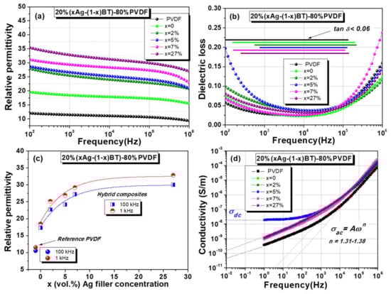 Room temperature dielectric properties of 20%(xAg − (1 − x)BT) − 80%PVDF flexible composites as a function of frequency: (a) Relative permittivity; (b) Dielectric loss ( (the frequency range for which is shown, for each composition); (c) Relative permittivity vs. Ag filler concentration (the lines are guides for the eye) (x); (d) Conductivity vs. frequency in log-log scale.
