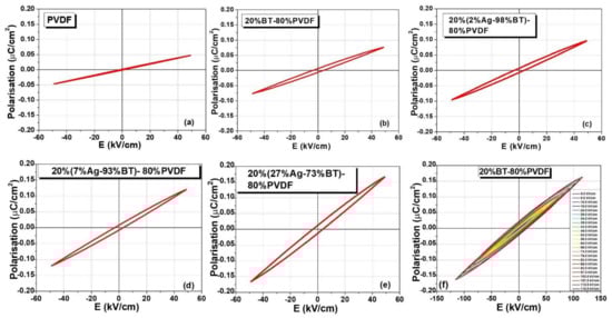 The polarisation-field P(E) dependences in the dynamic regime could be collected only in the sub-switching range (Rayleigh behavior). Similar field amplitudes of about 50 kV/cm loops are comparatively shown in Figure 7a–e. With exception of the lossy sample with composition x = 5 vol.% that did not show a proper response due to its higher dc conductivity, the other composites had breakdown fields in the range of 50–120 kV/cm and their initial permittivity reflects the same trend of increasing when increasing x, as found by the impedance spectroscopy study (shown in Figure 6c). No systematical decrease of the breakdown field was observed when including the hybrid filler and the composition that supported the highest applied field was 20BT-80%PVDF (Figure 7f). Even with this composition, no polarization switching was detected until its breakdown field and the recorded P(E) show only a slightly non-linear Rayleigh behavior. It is concluded that the permittivity enhancement produced by the hybrid filler addition and, in particular, by the presence of silver nanoparticles in these composites, is significant with respect to the best values reported in the literature [80] in spite of their modest storage capacity because they are not able to sustain the application of large fields. On this aspect, microstructural improvement by optimizing the processing parameters (in order to remove possible porosity, cracks, and filler agglomerations and to improve the sample homogeneity) might be further necessary in order to allow the composites to sustain the application of at least one order in magnitude higher fields. Nevertheless, their dielectric performances are similar to ones of other flexible materials proposed for mechanical-electrical energy conversion systems [6,11,15,18,19,20,21,22,23,24,25,26,27] whose permittivity increase due to the addition of BT and mostly of Ag nanoparticles is advantageous with respect to the permittivity of a few units as typically shown by pure polymers.