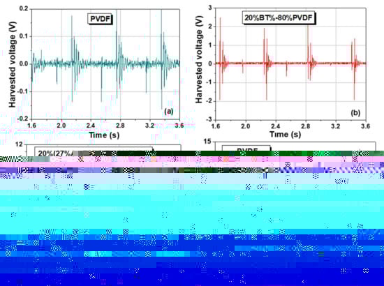 Further, Configuration 2 ensures a substantial response was used to compare the influence of BT and Ag-BT fillers into the PVDF matrix. The harvested responses of the pure PVDF, 20%BT–80%PVDF, and, of the composition with the maximum silver addition, 20%(27%Ag–73%)BT–80%PVDF composite thick films are presented and compared in Figure 9. All the flexible samples show a periodical voltage response with the same frequency as the applied mechanical testing and contain damped oscillations and periodical overdamped components. The qualitative examination of the relaxation time corresponding to the amplitude reduction indicates that the characteristic time is reduced when including 20 vol.% BT filler with respect to the case of PVDF and becomes even smaller for x = 27 vol.% Ag. The present results were collected using collecting load resistances of 10 MΩ, which is not yet the optimum matched load resistance to ensure a maximum harvesting output (Figure S5, Supplementary material); this aspect should be investigated in the future. A detailed study of the harvesting response with signal analysis as a function of mechanical excitation, its input energy and frequency, collecting resistance, sample geometry, its surface, and size, deserves a detailed analysis for all the compositions to reveal the role of inorganic insulating BT nanofiller and the metallic Ag nanoparticles.