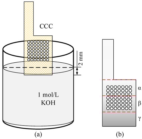 - The CCC was cleaned with methanol, ethanol, and deionized water in turn, and then the dried CCC was immersed in the KOH solution of 1 mol/L to corrode. As shown in Figure 3a, the CCC was placed vertically with the bottom immersed to a depth of 2 mm;