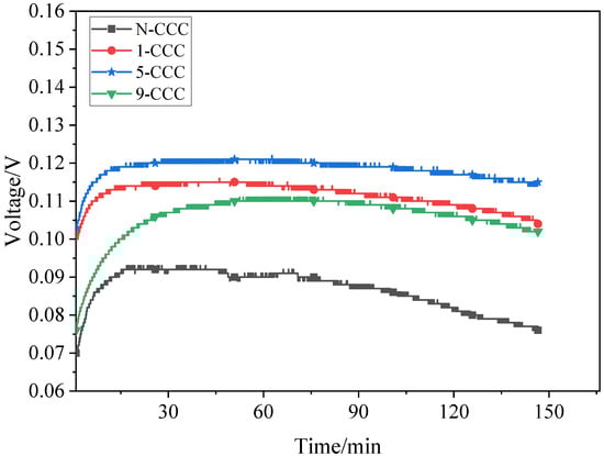 - At 1 h, compared to the N-CCC μDMFC, the discharge voltage of the 1-CCC μDMFC, 5-CCC μDMFC, and 9-CCC μDMFC increased by 27.28%, 33.33%, and 23.33%, respectively. The μDMFC with gradient wettability CCC shows better stability and higher discharge voltage.