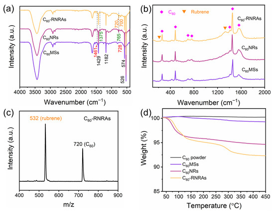 (a) FT-IR and (b) Raman spectra of C60MSs, C60NRs, and C60-RNRAs, (c) LDI-TOF mass spectrum of C60-RNRAs, and (d) TG analysis of C60 powder, C60MSs, C60NRs, and C60-RNRAs.