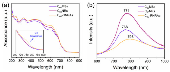 (a) UV-vis absorption spectra and (b) PL spectra of C60MSs, C60NRs, and C60-RNRAs.