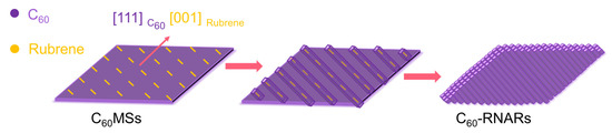 Based on the above results, we further investigated the transformation mechanism from C60MSs to C60NRs and C60-RNRAs. According to the XRD pattern of rubrene crystals prepared by evaporating the rubrene-m-xylene solution, rubrene of the same orthorhombic structure to the pristine rubrene powder is obtained. However, the most intense diffraction peak changes from the (400) peak for crystallized rubrene to the (002) peak for original powder, indicating the growth of rubrene along the [100] direction when m-xylene evaporates (Figure S4). HRTEM image of the rubrene film prepared by drop-drying the rubrene-m-xylene solution on the silica substrate displays a clear lattice spacing of 0.39 nm, which derives from the (400) plane of the orthorhombic rubrene, confirming again that the rubrene molecules crystallize along the [100] orientation with the gradually evaporation of m-xylene (Figure S8). The XRD and HRTEM results of rubrene crystals obtained by evaporating the rubrene-m-xylene solution are in line with the rubrene in C60-RNRAs, indicating the same growth behavior of rubrene in C60-RNRAs with the above rubrene crystals. Notably, the (222) plane of fcc C60 that grows along the [111] orientation has an interplanar spacing (d222 = 0.41 nm) close to that of the (400) plane of orthorhombic rubrene (d400 = 0.39 nm), thus affording the desired lattice matching for epitaxial growth of rubrene [29,30,31]. Therefore, as depicted in Figure 6, when the rubrene-m-xylene solution drops on C60MSs, the epitaxial growth of [001] oriented rubrene molecules on the [111] orientation of C60MSs is first achieved as m-xylene evaporates. Afterwards, the emerging intermolecular CT interactions between C60 and rubrene mediate the oriented growth of re-dissolved C60 molecules as m-xylene gradually evaporates, eventually leading to the formation of crystalline rubrene inside C60 nanorod arrays aligned parallelly to the obtuse diagonal of C60MSs.