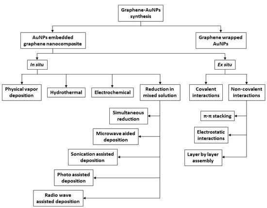 The synthetic procedures of AuNPs-graphene nanocomposites can be divided into two groups, as illustrated in Figure 5: AuNPs-embedded graphene nanocomposites and graphene-encapsulated AuNPs [61]. In this review, the reported examples include only the first option as the nanohybrid preparation method. The first group, i.e., AuNPs-embedded graphene nanocomposites, can be further subdivided into two classes of procedures: In situ and ex situ.