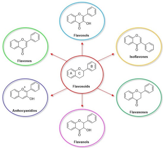 Among the natural antioxidants, there are compounds with only one phenolic ring such as phenolic acids and phenolic alcohols, and others with more than one phenolic ring commonly referred to as polyphenols. Different classifications have been reported in the literature, but according to the most accepted, they are grouped in phenolic acids, phenolic alcohols, lignans, stilbenes, and flavonoids [2,3]. Flavonoids can be further classified into six subclasses, namely flavonols, flavones, isoflavones, flavanones, anthocyanidins, and flavanols (catechins and proanthocyanidins) [3].