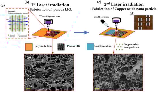 The fabrication process is illustrated in Figure 1. The laser path of the 355 nm UV pulsed laser is shown in Figure 1a. The laser power was 1.1 W, the laser scan mode was unidirectional, and the laser scanning speed was 60 and 40 mm/s. Table S2 shows the laser beam condition. The weak laser power prevents the excessive oxidation of LIG, which causes corrosion and weakens the photo-electrothermal effect. The other experimental details are described in the Supporting Information. The laser beam was scanned using a crosshatching process to form grooved LIG patterns with a porous structure. The hatch distance was fixed at 0.05 mm. Both the horizontal and vertical scan modes provided a high porosity to the surface. Figure S1 shows the LIG patterns fabricated using only the horizontal scan mode (0°). The porosity of this pattern was fabricated at the laser spot area. As shown in Figure 1b, the LIG patterns were directly fabricated with the laser scanning speed of 60 mm/s on a commercial polyimide (PI) film with a thickness of 125 μm (Kapton® from DupontTM Wilmington, DE, USA). Figure 1e shows the FEM image of Porous LIG. Then, 1% CuCl2 solution (Sigma-Aldrich, Saint Louis, MO, USA) was dropped on the LIG patterns for the formation of Cu oxide nanoparticles. The LIG sample containing the Cu solution was subsequently re-irradiated with the 355 UV pulsed laser under the laser speed of 40 mm/s, as shown in Figure 1c. Figure 1d shows the actual LIG with Cu oxide nanoparticles. For convenience, we refer to this material as Cu/LIG. Figure 1f shows the FE-SEM image of the Cu/LIG. This has porous structures nanoparticles on the surface.