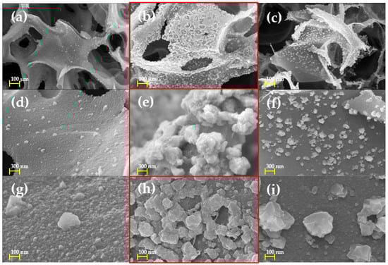 FE-SEM images of Cu/LIG patterns fabricated with varying amounts of Cu solution: (a,d,g) 2.5 µL; (b,e,h) 5 µL; (c,f,i) 7.5 µL.