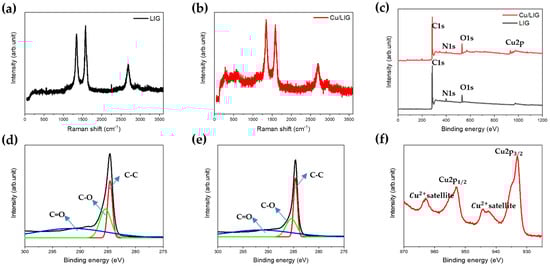 Raman spectra of (a) LIG and (b) Cu/LIG. (c) XPS characteristics of LIG and Cu/LIG, XPS C1s data of (d) LIG, (e) Cu/LIG, (f) XPS spectra for Cu 2p of Cu/LIG.