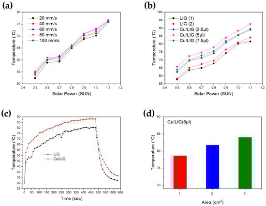 The excellent photothermal properties of Cu/LIG samples were observed, as shown in Figure 4. We graphed the data as the average value of the results of three or more experiments. Furthermore, we studied the temperature change of the sample surface according to the solar power (SUN), as shown in Figure 4a,b. Figure 4a shows the temperature as a function of solar power for LIG patterns fabricated according to the laser scanning speed. The solar generator supplied power from 0.5 to 1.2 sun in 0.1 increments. Each prepared sample was exposed for 3 min, and the temperature was measured using a thermal imaging camera. All samples showed a linear temperature increase from 0.5 to 1.1 sun. However, the difference temperature presented in Figure 4a is very small. We measured the surface temperature of the Cu/LIG surface according to the Cu solution from 0 to 7.5 µL in 2.5 increments, as shown in Figure 4b. LIG (1) and (2) showed the lowest temperature rise in all the samples, which confirmed that copper oxide nanoparticles improved the photothermal conversion properties of the LIG. Among the three Cu/LIG samples, Cu/LIG (5 µL) showed the highest temperature increase. Thus, the higher the Cu oxide particle content on the LIG surface, the larger the photothermal conversion. These results are consistent with the FE-SEM images showing that the amount of Cu oxide nanoparticles is largest at Cu/LIG (5 µL).