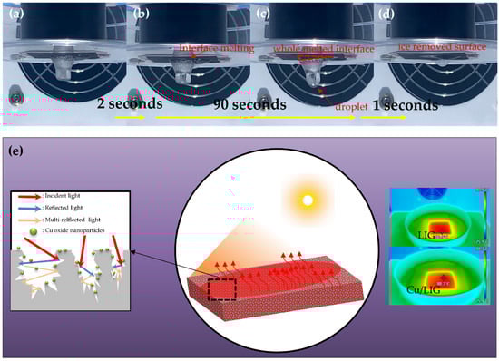 (a–d) Actual images of deicing based on photothermal effect with Cu/LIG fabricated with 5 µL of Cu solution. (e) Schematic illustration of the deicing mechanism based on photothermal effect and thermal image of the saturated temperature of LIG and Cu/LIG with 1 Sun.