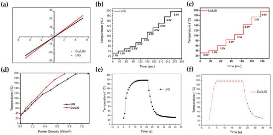 (a,b) I–V curve measurement of LIG and Cu/LIG. (b,c) Temperature evolution of LIG and Cu/LIG at stepwise voltage rise from 1 to 6 V. (d) Temperature as a function of the applied electrical power density for LIG and Cu/LIG. (e,f) Heating and cooling time for LIG and Cu/LIG.