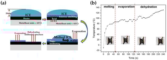 Aircraft icing refers to the formation of ice on the surface of an aircraft due to cloud particles or supercooled water droplets below the freezing point temperature [50]. Supercooled water droplets are most often observed between 0 °C and –20 °C [51]. Therefore, we conducted a deicing test while maintaining an environment at –10 °C. Figure S4 shows the process of the electrothermal performance test for deicing. First, 20 mm thick ice was formed on a 3 × 3 cm2 heater, which was attached above a cold metal to compensate for the real condition. Because of the heat sink and cold environment, we input a power density of 1.06 W/cm2. Figure 7a describes in detail how ice is finally vaporized. First, there is a state in which no voltage is applied to the heater. When voltage is applied, it undergoes rapid heating, which immediately creates water at the interface between the ice and heater. Water can reduce the adhesion of the ice and heater interface [52]. This means that ice can be removed easily by external forces such as wind and gravity. The third schematic shows that most of the heat is used to melt the ice again, but the edge side far from the ice undergoes evaporation. In this step, some of the moisture penetrates the 3D porous structure of the microscale. When whole ice is melted, as in the fourth image, all the heat is used to vaporize the moisture on the surface. Then, the temperature of the heater surface rises rapidly. Through this process, the heater was transformed into a completely dried state. This additional process must prevent icing because the remaining moisture on the surface subsequently acts as a frozen seed [53].