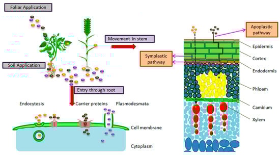 Nanoparticles are microscopic particles, usually ranging from 1–100 nm. The commonly used nanoparticles for the formulation of nanobiofertilizer are silicon, zinc, copper, iron, and silver. The uptake and accumulation of nanoparticles in plants depends on their chemical composition, shape, size, and agglomeration state. The translocation of nanoparticles is inversely proportional to their size. It is also linked to the plant species, as the receptors vary from plant to plant. A plant may act as an accumulator for one type of nanoparticle and an excluder for another kind of nanoparticle. Different nanoparticles use different mechanisms to improve the growth of plants [24,25]. Figure 2 represents the application of nanoparticles and their movement inside plants. When the nanoparticles are applied in the rhizosphere they enter in plant roots by endocytosis, through carrier proteins, or by plasmodesmata. When they are applied in the form of foliar spray they simply diffuse through the stomata and enter the vascular bundles. They also travel inside the plant by following symplastic and apoplastic pathways. The pathway of the nanoparticles’ movement depends on the type of plant and type of nanoparticles [26,27]. The detail of nanoparticles used in the synthesis of nanobiofertilizer is as given below.