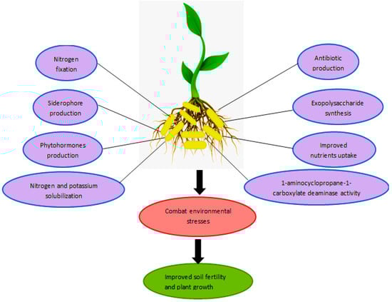 Around 800 million people suffer from chronic hunger worldwide, and this figure may rise with time. Moreover, humans suffer from many health issues due to unstable and low-quality food [1]. The nutritional quality of the crop is linked with climate change, as unpredictable seasonal and spatial variations disturb crops’ life cycles. Various biotic and abiotic stresses affect the crop’s production and nutritional quality. Ultraviolet radiation damages plant cells and disturbs the structure of cell organelles. Drought stress directly decreases the rate of photosynthesis in plants. It also poses negative effects on cell enlargement, cell division, and differentiation [2,3]. The weathering of parent rock material, industrial waste and sewage sludge discharge, and uncontrolled use of heavy-metal-containing agrochemicals cause high soil salinity, heavy metal contamination, etc. [4,5]. These agrochemical fertilizers end up in water bodies and cause eutrophication. The long-term use of agrochemicals has negatively impacted soil health and human health. This has been a major cause of soil and water pollution, soil erosion, nutrient imbalance, lessened agrobiodiversity, decreased soil fertility, and low water holding capacity, and has caused disturbances in natural soil flora and fauna [6]. The use of excess nutrients is polluting soil, and water scarcity makes the condition worse [7]. It was reported that a large portion of synthetic nutrients are not absorbed by plants, and instead run off from the fields and become integrated into water resources. The excess amount of synthetic nutrients causes serious concerns about food safety as well as its quality. There is a need to focus on the development of sustainable agricultural practices. We cannot replace the use of chemical fertilizers, but we can use other strategies so that they have beneficial effects. Plants are facing various stresses in their natural habitat that reduce their growth [8,9]. Plants undergo different morphological, physiological, and biochemical changes during stress conditions. Plants face several stresses such as drought, salinity, freezing stress, heat stress, and heavy metal stress. When plants are exposed to adverse conditions, the rate of formation of reactive oxygen species (ROS) becomes high, which causes oxidative stress, reduces the membranes’ stability, and affects the structure and functions of organelles in the plant cells. If the stress occurs at the anthesis stage, the ovaries are aborted, and the fertilization rate is reduced [10]. There is a need to develop environmentally friendly strategies for the amelioration of stresses and to increase the yield of crops. This can be achieved by enhancing the productivity of crops and by expanding the area under cultivation. The former approach is more suitable, and can be attained through biofertilizers. Biofertilizers release various metabolites, plant hormones, and polysaccharides that improve soil quality and plant growth. They have inhibitory effects on the growth and proliferation of different plant pathogens. They create tolerance or resistance in plants against biotic stress [11,12,13]. The use of plant-growth-promoting rhizobacteria (PGPR) as biofertilizers has been suggested as one of the most suitable and sustainable approaches for improving crop yield. They enhance the growth of plants by a variety of direct and indirect mechanisms. Direct mechanisms include nitrogen fixation, production of siderophore, phytohormone, and exopolysaccharide, and solubilization of phosphorus and potassium. Their inoculation in the rhizosphere makes the plants stress-tolerant or stress-resistant. Their use also minimizes the dependency on chemical fertilizers [14]. Application of Azospirillum sp. improves the germination and morphological characteristics of Triticum aestivum L. under abiotic stresses [15]. Inoculating PGPR decreases electrolyte leakage and increases the relative water content and proline synthesis in wheat [16] and soybeans [17]. Pod fresh weight, pod number, and seed weight were also significantly improved by biofertilizer compared to untreated plants under drought stress [18].