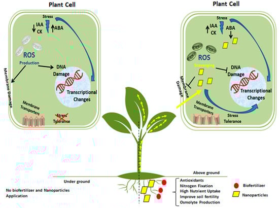 The use of nanobiofertilizer improves plant growth significantly. The coating of nanoparticles with biofertilizers enhances the efficiency of biofertilizers and causes the sustained and slow release of nanoparticles in the plant’s rhizosphere. They maintain the dissolution of fertilizer and reduce the chances of leaching [120]. They also enhance the quality of crops, i.e., the production of secondary metabolites such as enzymatic (catalase, superoxide dismutase, and peroxidase) and nonenzymatic antioxidants (Phenols and flavonoids) is increased. These metabolites increase the shelf life of vegetables and fruits and have various health benefits [121]. The synergistic mechanism of action of biofertilizer and nanoparticles gives intensified responses when applied to plants. It activates different mechanisms in plants responsible for the better development and yield of plants. They also mitigate the adverse effects of toxic chemicals and reduce or inhibit the growth of pathogens in the rhizosphere of plants (Table 2). Nanobiofertilizers aid in bioremediation and replenish essential nutrients in the soil. They upregulate genes responsible for producing antioxidants, osmolytes, and stress-related proteins, reduce the damaging effects of ROS on plants, and maintain the structure and function of the cell. They also preserve membrane transporters’ enhanced hormonal production and their activities [122,123]. Figure 4 shows the response of plant cells under water stress and the effect of the application of nanoparticles and biofertilizers. When the plants receive these treatments, their antioxidant systems become active, protecting the cell membrane and organelles from the adverse effects of stress. They also increase their levels of growth hormones, including indole acetic acid and cytokinin, while reducing the production of stress hormones (abscisic acid). These changes make the plant stress-tolerant and increase the chances of crop establishment under unfavorable environmental conditions [124].