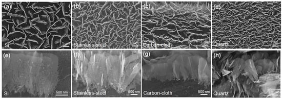 Top-view and side-view of the morphology of VFLG on different substrates. (a,e): Si substrate; (b,f): stainless-steel substrate; (c,g): flexible carbon-cloth substrate; (d,h): quartz substrate.