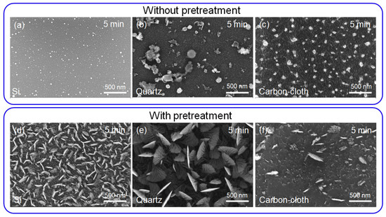 The surface energy of substrates’ influence on VFLG growth. (a–c) represent a VFLG growth time of 5 min on different substrates without pretreatment, where (a) is Si, (b) is quartz and (c) is flexible carbon-cloth. (d–f) show a VFLG growth time of 5 min on different substrates with pretreatment, where (d) is Si, (e) is quartz and (f) is flexible carbon-cloth.