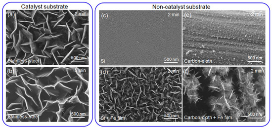 The influence of catalysis on VFLG growth. VFLG growth of 2 min (a) and 5 min (b) on stainless-steel substrates with pretreatment. VFLG growth of 2 min on (c) Si, (d) Si + Fe film, (e) flexible carbon-cloth and (f) flexible carbon-cloth + Fe film substrates with pretreatment.