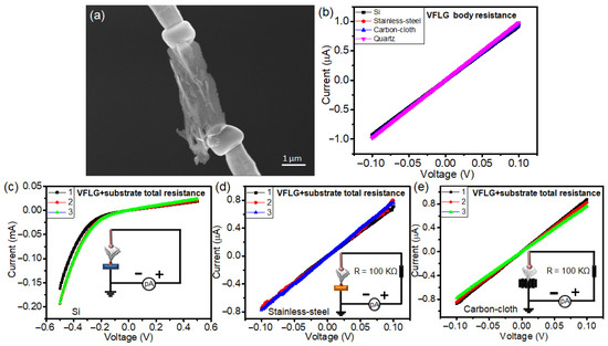 In contrast, the electrical conductivity properties of the VFLG on the substrate showed differences. In this measurement, one probe was brought into contact with the top of the VFLG and the other probe with the substrate. The total resistance of the VFLG and that of the substrate were measured together (including the VFLG body resistance, the contact resistance and the substrate resistance). Figure 6c–e shows the I-V characteristics of the VFLG on Si, stainless-steel and flexible carbon-cloth substrates. According to nonlinear rectifying behavior of the Schottky contact, it is obvious that the interface between the VFLG and the Si substrate was not Ohmic contact but Schottky contact (Figure 6c). Compared to the Si substrate, the I-V characteristics of the VFLG on stainless-steel and flexible carbon-cloth show good Ohmic contact (Figure 6d,e). Total resistance of the VFLG on Si, stainless-steel, flexible carbon-cloth substrates was 2.4 × 104 Ω, 3.3 × 104 Ω, 2.07 × 104 Ω, respectively. The resistance of probe to probe, probe to Si substrate, probe to stainless-steel substrate and probe to flexible carbon-cloth substrate was about 4.76 Ω, 2127 Ω, 4.96 Ω and 96.15 Ω, respectively (Supplementary Materials Figures S7 and S8), which means the substrate resistance was small and, other than that of the Si substrate, can be ignored. Therefore, the contact resistance at the interface is the main type that is an order of magnitude larger than the VFLG body resistance. The contact interface of the VFLG and the substrates play a key role in determining the resistance of the VFLG on substrates and should be reduced when aiming for device application.
