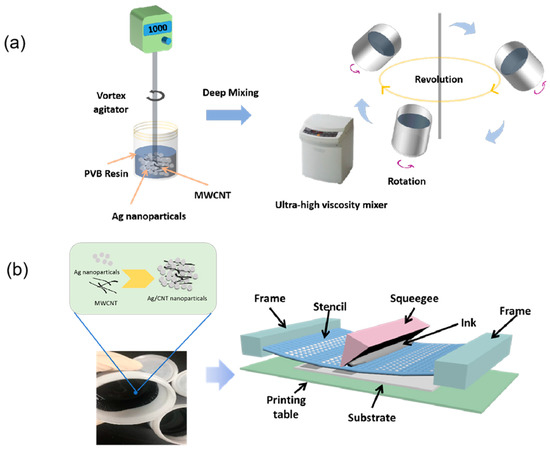 As shown in Figure 1a, a simple, low-cost, room temperature chemical solution process was used to prepare the Ag/CNT paste. The ratio of the Ag/CNT, dispersant (FC-4430), solvent–resin vehicle (Butyl carbitol/PVB—3.75:21.25), thicker (Sterocoll® HS), defoaming agent (FoamStar® SI 2213), and wetting agent (Hydropalat® WE 3475) was 2.4:47.7:0.1:47.7:1:0.1:1. The materials were mixed using a vortex agitator (Daihan Scientific, Wonju, South Korea) at 1000 RPM for 12 h. The paste was transferred to a planetary centrifugal bubble-free mixer (ARE-310, THINKY U.S.A., Inc., Laguna Hills, CA, USA) for 20 min, then degassed for 5 min, and this process was repeated three times.