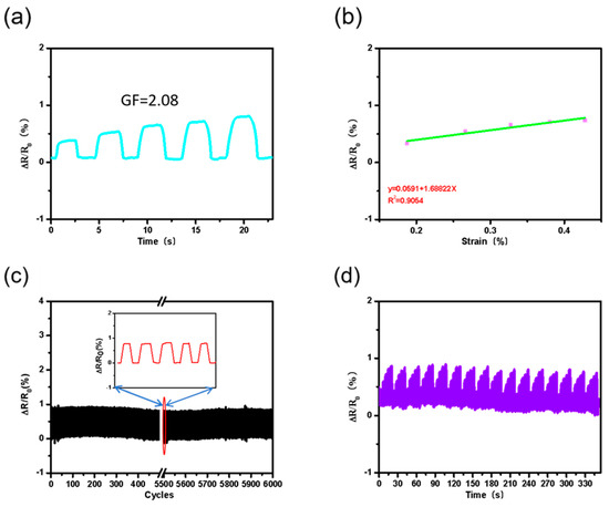 To investigate the sensing properties of the Ag/MWCNT composite printed on the PEN, we characterized the sensor with the applied strain under tension from 0.1% to 0.5% (Figure 4a). The gauge factor, defined as [G.F. = (ΔR/R0)/ε] [46,47], was calculated as 2.08 to determine the sensitivity of Ag/MWCNT composite strain sensors. Here, R0 denotes the resistance of the composite strain sensor without strain, ΔR denotes the resistance change under strain, and ε denotes the strain. This value is generally found in commercial strain sensors. In addition, we found the linearity of the sensor to be 90%, as shown in Figure 4b. To measure the response repeatability and durability according to line width, repeated stretching and release cycles were applied on the sensors. Figure 4c shows the resistance changes of the sensors, resulting in a fully recoverable electrical resistance without hysteresis at 0.306% of stretching for 6000 cycles. In addition to the cyclic stability test under a single strain, the high stability of the sensor was demonstrated under continuous and diverse strains (Figure 4d).