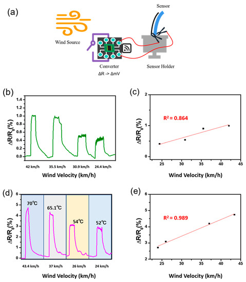 To measure the wind sensing ability of the screen-printed sensor based on the wind velocity and temperature, the sensor was adapted to a home-made sensing system with a wind gauge, as can be seen in Figure 5a. The wind velocity range was from 24.4 km/h to 42 km/h, while the sensing sensitivity was expressed as an average value measured per minute for each level. Figure 5b reveals the effects of wind velocity on resistance changes, resulting in decreased resistance with wind velocity. Since lower wind velocity induces lower applied pressure to the surface of the flexible sensor, this leads to decreased bending pressure. Figure 5c shows the linearity calculation, with the result found to be 86%, based on the result of the wind velocity change. This is lower than the 90% obtained in the bending test, as shown in Figure 4a. Since the wind velocity causes sensor vibration during the measurement, stability issues may occur because of this side effect. We also investigated the sensing effect according to temperature change, using a range from 52 °C to 70 °C, at the same wind velocity shown in Figure 5d. As a result, the resistance change was increased to about 5 times higher than at room temperature due to the intrinsic properties of the metal hybrids. The linearity was 98%, as shown in Figure 5e, which was >10% higher than that of the wind velocity change at room temperature dur to the high thermal coefficient of Ag. These results prove that the sensor is also sensitive to the temperature effect with precise linear sensing features.
