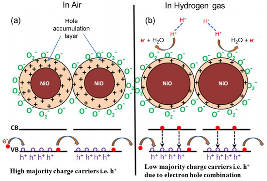 Schematics of H2 sensing mechanism for NiO sensor. Hole accumulation of the NiO sensor exposed in air (a) and hydrogen (b), respectively. Reprinted with permission from Ref. [37]. Copyright 2018 Elsevier.