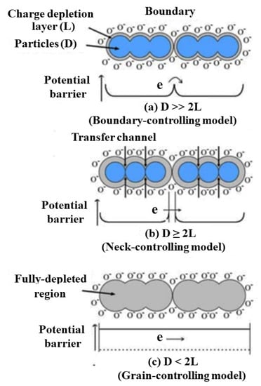 The grain size, morphology, and porosity are important factors for affecting the sensing performance of semiconductor-based gas sensors. In gas sensors, semiconductor nanoparticles are connected to adjacent particles through grain boundaries to form larger aggregates [41]. On the particle surface, the adsorbed oxygen molecules extract electrons from the conduction band and capture electrons in the form of ions on the surface, resulting in band bending and electron depletion layers, as shown in Figure 4 [42,43]. Since the transport of electrons between grains needs to pass through the electron depletion layer, the grain size has a great influence on the conductivity, which in turn affects the gas sensing performance of the material-based gas sensor. When the particle size (D) is much larger than twice the thickness (L) of the electron depletion layer (D >> 2L), there is a wide electron channel between the grains, and the gas sensitivity of the material is mainly controlled by the surface of the nanoparticles (boundary control). When D ≥ 2L, there is a constricted conduction channel. The change in electrical conductivity depends not only on the particle boundary barrier but also on the cross-sectional area of the channel, and the gas sensitivity of the material is mainly controlled by the contact neck between nanoparticles (neck control). When D < 2L, the electron depletion layer dominates, the entire nanoparticle is contained in the electron depletion layer (grain control), and the sensitivity of the material is very high. The energy bands are nearly flat throughout the interconnected grain structure, and there is no significant impediment to the inter-grain charge transport. The small amount of charge gained from the surface reaction results in a large change in the conductivity of the entire structure. Therefore, the smaller grain size is beneficial to improving the sensitivity of the gas sensor. When the grain size is small enough, the crystal becomes very sensitive to the surrounding gas molecules. For example, Min et al. used SnO2 as the sensing material to prepare SnO2 films with different particle sizes (8.4–18.5 nm) and different porosity (70.8–99.5%), and found that in the gas sensors with porous structure, high porosity and low average particle size exhibited quicker gas sensing response [44].