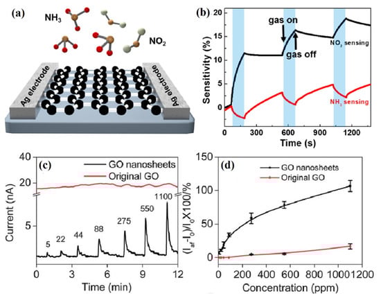 GO is suitable for gas sensors due to its multiple properties, such as easy processing, high solubility in various solvents, and containing oxygen functional groups or defects. Since the defects or functional groups in GO can act as reaction sites for gas adsorption, making the gas easily adsorbed on the surface of GO and improving the selectivity and sensitivity of the GO-based sensor, the response of the GO-based sensor can be tuned by functionalization. Shen et al. [70] prepared edge-trimmed GO nanosheets by periodically acid-treating GO, and then fabricated field effect transistors (FETs) for gas sensing testing of SO2 at room temperature (Figure 5c,d). Compared with pristine GO nanosheets, edge-clipped GO nanosheets were found to have a significant response enhancement effect to SO2 gas, and the detection concentration range was 5–1100 ppm. Meanwhile, the edge-trimmed GO device also exhibited a fast response time, which was mainly attributed to the hygroscopic properties of the GO nanosheets, which can trap water molecules and react with SO2 to generate sulfuric acid to facilitate their fast protonation process. By utilizing different reducing agents to remove oxygen from GO and recover aromatic double-bonded carbons, the selectivity of RGO-based gas sensors could be improved significantly. For example, Guha et al. [71] developed a gas sensor for NaBH4 reduction of GO on a ceramic substrate and reported its performance for detecting NH3 at room temperature. The response to NH3 can be optimized by the reduction time of GO. Through chemical modification, RGO can introduce some foreign groups or atoms to change its surface properties, which can enhance its sensing performance. For example, the response of RGO reduced with p-phenylenediamine (PPD) to dimethyl methylphosphonate (DMMP) was 4.7 times higher than that of RGO reduced by ordinary methods [72]. The RGO-based gas sensor reduced by ascorbic acid has high selectivity for corrosive NO2 and Cl2, and the detection limit can reach 100 and 500 ppb, respectively [73].