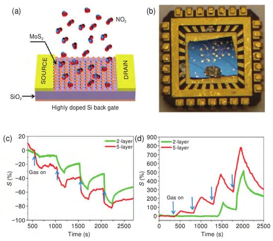 Sensing behavior of atomically thin-layered MoS2 transistors. (a) Schematic of the MoS2 transistor-based NO2 gas-sensing device. (b) Optical photograph of the MoS2 sensing device mounted on the chip. Comparative two- and five-layer MoS2 cyclic sensing performances with NH3. (c) and NO2 (for 100, 200, 500, 1000 ppm) (d). Reprinted with permission from Ref. [78]. Copyright 2013 ACS.