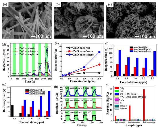 SEM images of (a) ZnO nanorods, (b) ZnO nanoflowers and (c) ZnO nanospheres. (d) Dynamic response curves with time of three different ZnO nanostructures; (e) the response curves with NO2 concentration of three different ZnO nanostructures; (f,g) the response and recovery time of three different ZnO nanostructures; (h) the repeatability of three different ZnO nanostructures to 5 ppm NO2; (i) the selectivity of three different ZnO nanostructures to other harmful gases. Reprinted with permission from Ref. [130]. Copyright 2021 Elsevier.