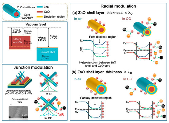 - Kim, J.H.; Katoch, A.; Kim, S.S. Optimum shell thickness and underlying sensing mechanism in p-n CuO-ZnO core-shell nanowires. Sens. Actuators B Chem. 2016, 222, 249–256. [Google Scholar] [CrossRef]
