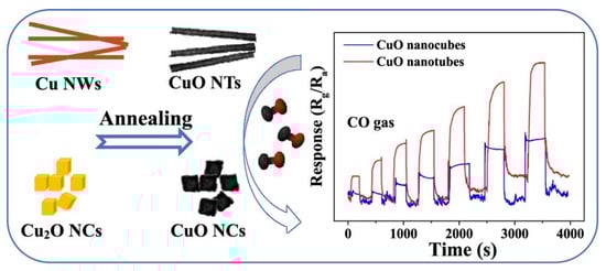 The preparation of CuO NTs and CuO NCs and CO gas-sensing behaviors of CuO NTs and CuO NCs at the operation temperature of 175 °C with different CO concentrations (50–1000 ppm). Reprinted with permission from Ref. [142]. Copyright 2018 Elsevier.