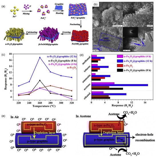 Yu et al. [187] successfully synthesized α-Fe2O3@graphene nanocomposites using a simple low-temperature hydrolysis and calcination process, and fabricated the synthesized materials into gas sensors to detect different gases. Their prepared α-Fe2O3@graphite nanocomposites consist of porous α-Fe2O3 nanorods stably and orderly grown on graphitic nanosheets, as shown in Figure 12a,b. The length of α-Fe2O3 nanorods is related to the reaction time. When the reaction time was 12 h, the length reached a maximum value of about 200–300 nm, and the pore size was about 3.7 nm. Compared with pure α-Fe2O3, the α-Fe2O3@graphite nanocomposite-based sensor exhibited higher sensing performance for acetone. At the optimal temperature of 260 °C, the response of α-Fe2O3@graphite nanocomposites to 50 ppm acetone reaches a maximum value of 16.9, which was 2.2 times that of α-Fe2O3, as shown in Figure 12c. The high sensing performance was attributed to the porous structure, high specific surface area, and p-n heterostructure of α-Fe2O3@graphite nanocomposites and the high temperature stability of graphite. When α-Fe2O3 was recombined with graphite, due to the large gradient of the same carrier concentration, the electrons in α-Fe2O3 and the holes in graphite diffuse in opposite directions, so that a built-in electric field is formed between the interfaces, and the electrons in the depletion layer. The energy bands bend until the system reaches equilibrium at the Fermi level (EF), leading to the formation of a p-n heterojunction. Once the α-Fe2O3@graphite heterojunction sensor is exposed to acetone gas, the oxygen anions adsorbed on the sample surface undergo a redox reaction with acetone molecules and release electrons back into α-Fe2O3, resulting in a decrease in the resistance of the sensor. At the same time, acetone releases electrons to combine with holes in p-type graphite, resulting in a decrease in hole concentration. The reduction of holes in graphite leads to an increase in electrons and reduces the concentration gradient of the same carriers on both sides of the p-n heterojunction. Therefore, the diffusion of carriers was weakened and the barrier height of the depletion layer was reduced, which further reduced the resistance of the α-Fe2O3@graphite sensor, as shown in Figure 12e.