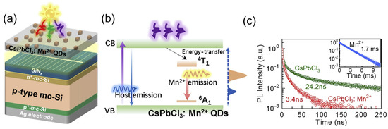 - Wang, Q.; Zhang, X.; Jin, Z.; Zhang, J.; Gao, Z.; Li, Y.; Liu, S.F. Energy-down-shift CsPbCl3:Mn quantum dots for boosting the efficiency and stability of perovskite solar cells. ACS Energy Lett. 2017, 2, 1479–1486. [Google Scholar] [CrossRef]
