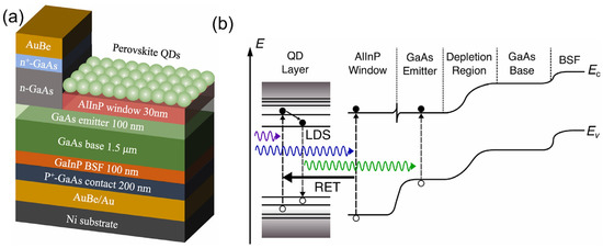 - Cho, Y.Y.; Huang, Y.M.; Hsu, S.C.; Kao, S.F.; Shih, H.Y.; Lee, T.Y.; Liu, Y.H.; Chen, T.M.; Kuo, H.C.; Lin, C.C. The Luminescent Down Shifting Effect of Single-Junction GaAs Solar Cell with Perovskite Quantum Dots. In Proceedings of the 46th Photovoltaic Specialists Conference (PVSC), Chicago, IL, USA, 16–21 June 2019. [Google Scholar]