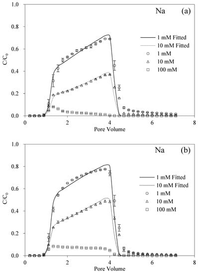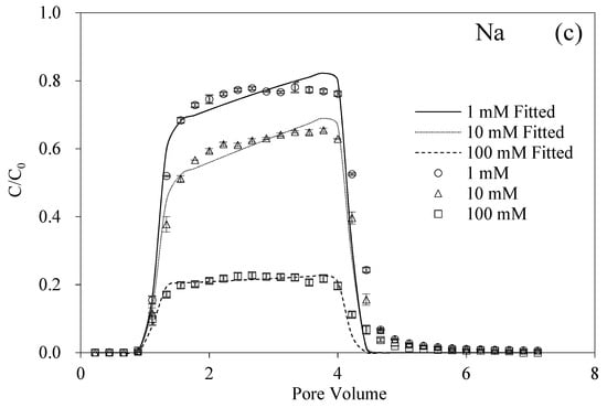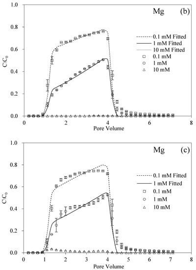 The breakthrough and fitting curves of BMBC are shown in Figure 1. The retention of BMBC in the packed columns decreased with the HA concentration. Under the condition without HA or cations, BMBC manifested a strong mobility and a slight tailing phenomenon in the elution process. As the concentration of HA increased, the maximum value of BMBC breakthrough curves increased and the BMBC concentrations declined at the tail. It can be obtained from Table 2 that when the HA concentrations were 0, 1, and 5 mg L−1, the corresponding recovery rates of BMBC were 74.29%, 76.89%, and 83.93% and the fitted Smax decreased from 42.85 to 25.00 mg g−1. The same trend was maintained with the addition of the different cations (Na+, Mg2+, and Al3+) in most cases. Moreover, the presence of HA retarded the ripening phenomenon caused by 100 mM Na+, and maintained the transport of BMBC at 5 mg L−1. However, the facilitated effect of HA hardly functioned at 10 mM Mg2.