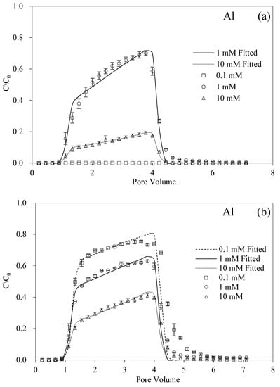 The advection-dispersion equations could also well describe the transport of BMBC under the effect of Al3+ and HA. Except for the unfavorable condition of 0.1 mM, the recoveries of BMBC were 59.35% and 14.97% and the Smax values were 47.09 mg g−1 and 189.80 mg g−1 at ISs of 1 mM and 10 mM, respectively. From recovery rates that were approximately 60%, while the addition of HA in IS 1 mM did not influence the mobility of BMBC, the fitted parameters, however, sequentially were 47.09, 62.49, and 55.37 mg g−1 at 1 mM from HA 0–5 mg L−1. The difference was also reflected in the breakthrough curves. In particular, these curves went from “sharp” (rapid rise) to more “smooth” (asymmetric rise in the plateau), and the maximum normalized concentration of BMBC changed from 0.70 to 0.63 and 0.64 with the addition of HA, which represented a typical detachment decline process, and the simulated k values of BMBC decreased from 2.10 × 10−2 to 1.72 × 10−2 and 1.71 × 10−2 min−1 []. It could be concluded that the existence of HA influenced mechanically the transport of BMBC. Furthermore, it was reported that the effect of HA easily reached the upper limit (especially over 4 mg L−1), which was more obvious for considering the fitted Smax values of BMBC significantly decreased from 189.80 to 99.46 and 89.82 mg g−1 [].