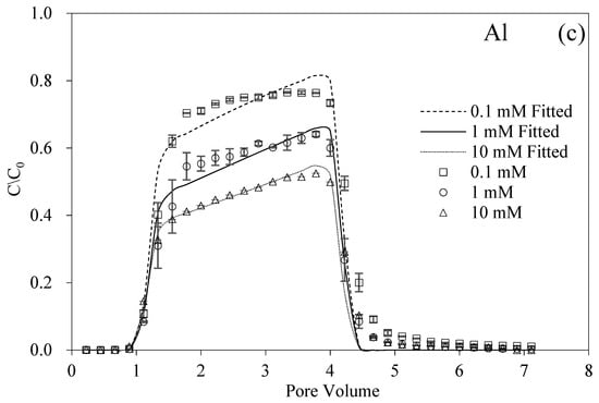 For the different ISs of Al3+, the presence of HA could influence the transport of BMBC in porous media, as shown in Figure 4b,c. The breakthrough curves of BMBC shared the same pattern that the normalized concentrations rapidly increased and then reached the maximum value relatively slowly, which demonstrated that the particle–solid association was temporarily retained and the reversible deposition therefore detached []. The solution chemistry of low pH could enhance the affinity of dissolved organic matter (i.e., HA) to BMBC under the effect of electrostatic interaction [,]. As a consequence, the zeta potentials of BMBC became more negative with the adsorption of HA. On the other hand, the strong binding sites on HA were occupied and the binding affinity from inducing conformational changes of the humic macromolecule was reduced, which made binding sites unavailable [,]. The limited effect from the dilute concentration of Al3+ could not cover the facilitated effect of HA. Therefore, the addition of HA restored the mobility of BMBC in porous media.