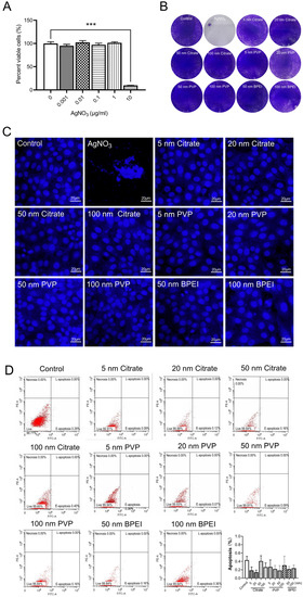 - House, J.S.; Bouzos, E.; Fahy, K.M.; Francisco, V.M.; Lloyd, D.T.; Wright, F.A.; Motsinger-Reif, A.A.; Asuri, P.; Wheeler, K.E. Low-Dose Silver Nanoparticle Surface Chemistry and Temporal Effects on Gene Expression in Human Liver Cells. Small 2020, 16, e2000299. [Google Scholar] [CrossRef] [PubMed]