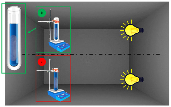 Photocatalytic experiments were carried out inside a homemade apparatus (Figure 1a) composed of a 150 mL glass test tube (from here called reactor) kept at a fixed distance of 25 cm from a solar lamp (OSRAM ultra vitalux, Wattage 300 W, OSRAM Opto Semiconductors GmbH, Regensburg, Germany). To avoid any influence of light radiation from both natural and artificial sources, this apparatus was installed into a blacked-out fume hood.