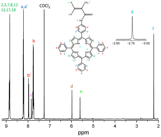 The chemical structure of MAP was confirmed through NMR experiments. The 1H-NMR spectrum (CDCl3, 500 MHz, Figure 3) shows a multiplet at 8.85 ppm (8H, C-H pyrrole protons in 2,3,7,8,12,13,17,18 positions); two unresolved multiplets at 8.21 ppm (8H, C-H phenyl protons, a, a’); a multiplet at 7.96 ppm (2H, C-H phenyl protons, b’); a singlet at 7.85 ppm (1H, N-H amide proton, c); a multiplet at 7.75 ppm (9H, C-H phenyl protons, b); a singlet at 5.97 ppm (1H, C-H vinyl proton, d); a singlet at 5.60 ppm (1H, C-H vinyl proton, e); a singlet at 2.21 ppm (3H, C-H methyl protons, f); a singlet at −2.78 ppm (2H, N-H pyrrole protons, g).