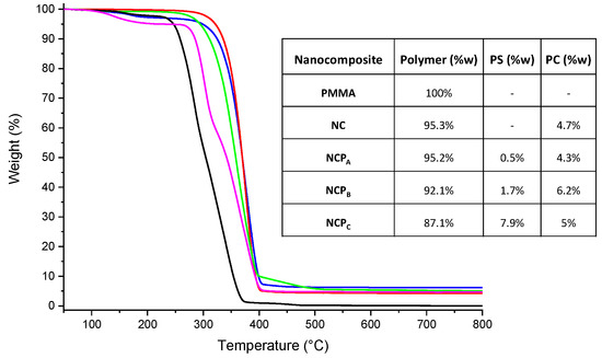 TGA traces of PMMA (black line), NC (magenta line), NCPA (red line), NCPB (blue line) and NCPC (green line). In the inset: the content of polymer matrix, photosensitizer (PS) and photocatalyst (PC) in each nanocomposite.