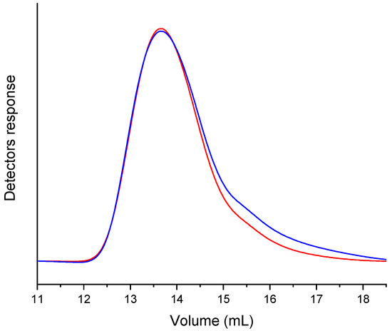 GPC traces of the soluble fraction (in THF) of the nanocomposite NCPB, acquired with UV-Vis (set at 416 nm, blue line) and RI (red line) detectors connected in parallel.