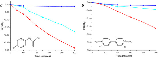 Photodegradation kinetics of acetaminophen (a) and paraquat (b) in the presence of thin films of NC (cyan line) and NCPB (red line) and their photolysis (blue line).